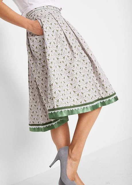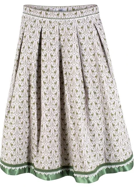 Jupe bavaroise élégante style patineuse. Modèle confortable avec base évasée au volume dansant. Joli motif cerf et galon en satin décoratif à la base. Large empiècement à la taille avec plis. Cette jupe bavaroise en coton de bpc s’associe à merveille avec un blazer cintré et des jolis escarpins. Long. d’env. 58 cm à 62 cm, lavage machine.