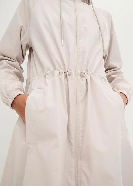 Capuche, cordon coulissant pour ajuster l’ampleur, avec protège-menton, poches passepoilées et mitaines en bas de manches.