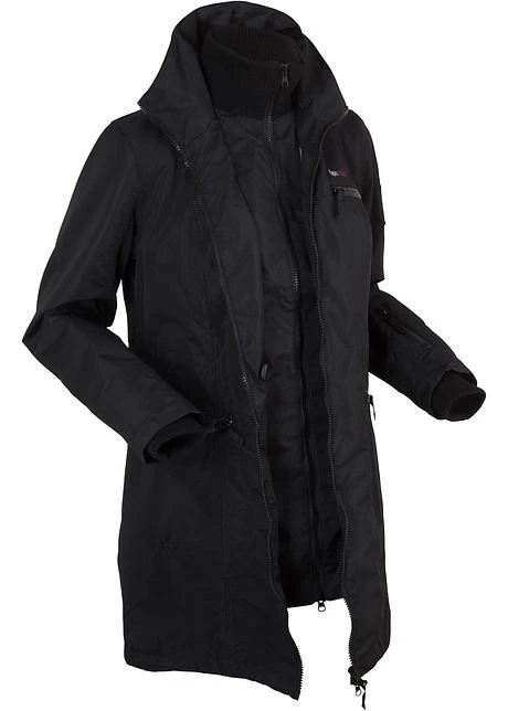 Look 2 en 1 avec empiècement pare-vent zippé supplémentaire, queue-de-pie au dos, poches zippées, poche intérieure avec sortie pour câble d’écouteurs, long. env. 94 cm.