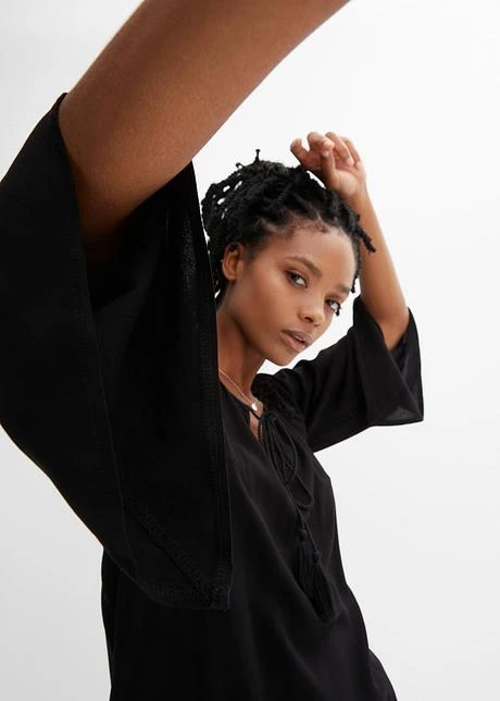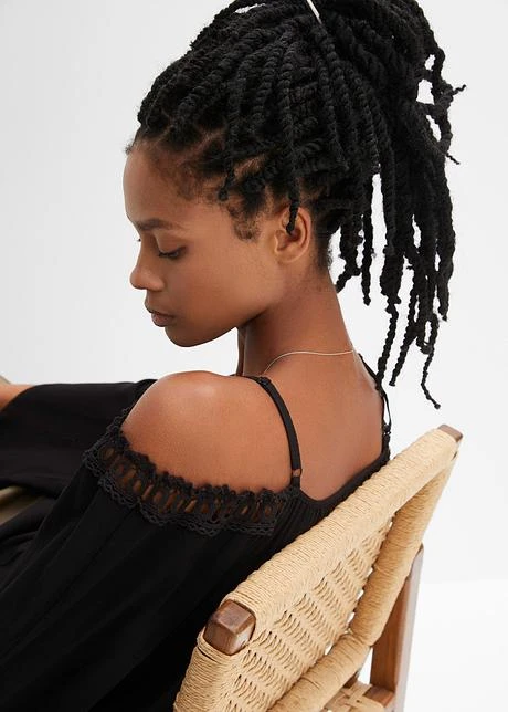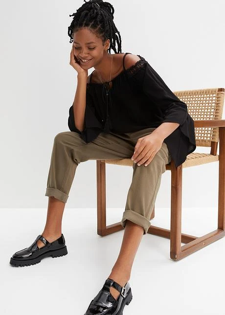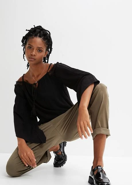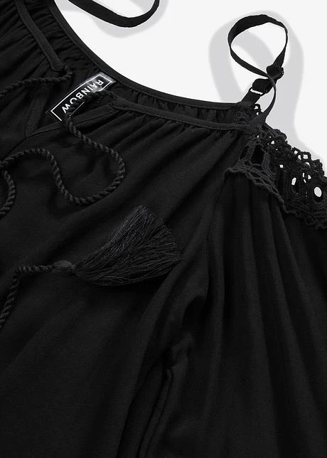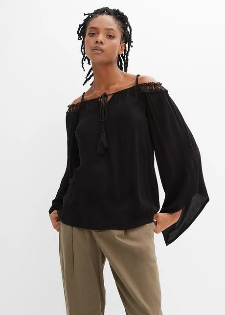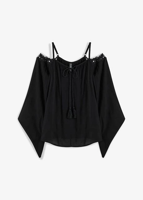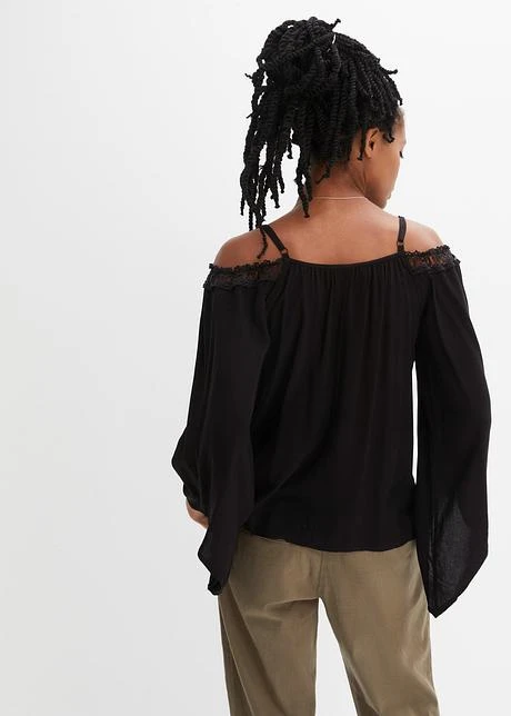 Ravissante blouse à encolure façon Carmen avec dentelle aux épaules et bretelles réglables. Long. env. 46 cm.