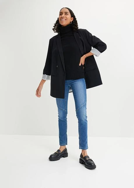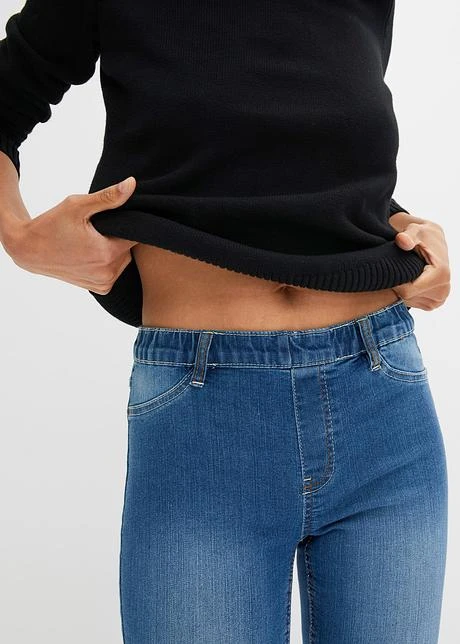Deux coutures centrales en biais sur les jambes. Jean jegging élastique avec revers en bas de jambes. Long. entrejambe env. 78,5 cm.