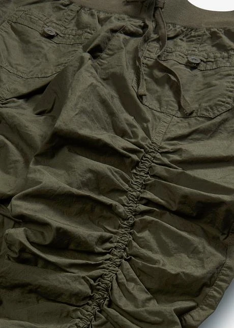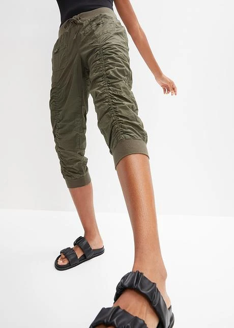 Taille côtelée entièrement élastiquée et jambes 3/4 froncées. Long. entrejambe env. 55 cm.