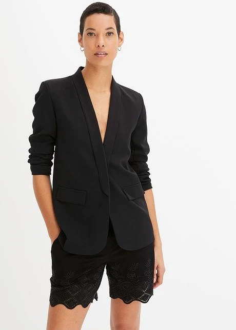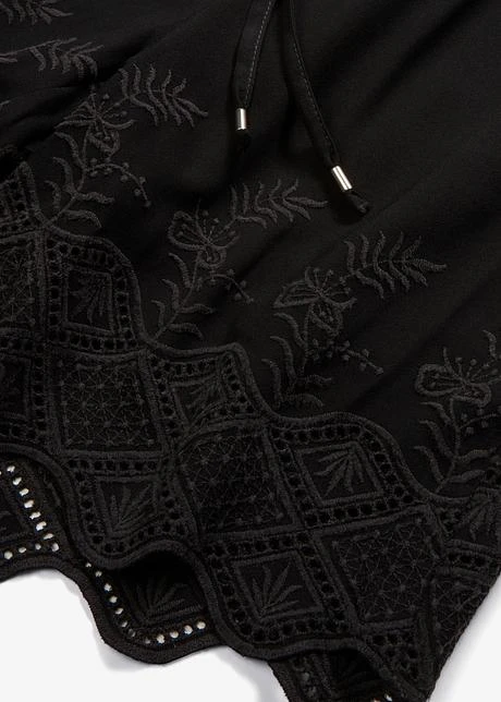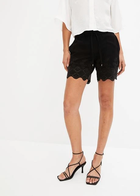 Superbe short estival avec une broderie en bas de jambes. Empiècement élastique à la taille avec lien à nouer. Avec doublure. Long. entrejambe env. 15,5 cm.