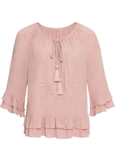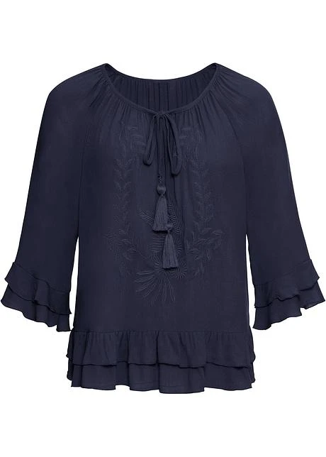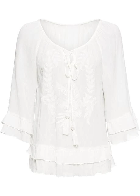 Jolie blouse stylée façon bohème avec broderie décorative ton sur ton. Les volants à la base ajoutent une touche d’originalité. Avec encolure ronde et liens à nouer. Long. env. 60 cm.