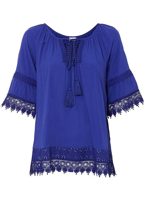 Tunique féminine avec large dentelle à la base et aux manches, et un magnifique décolleté au crochet. Long. env. 66 cm.