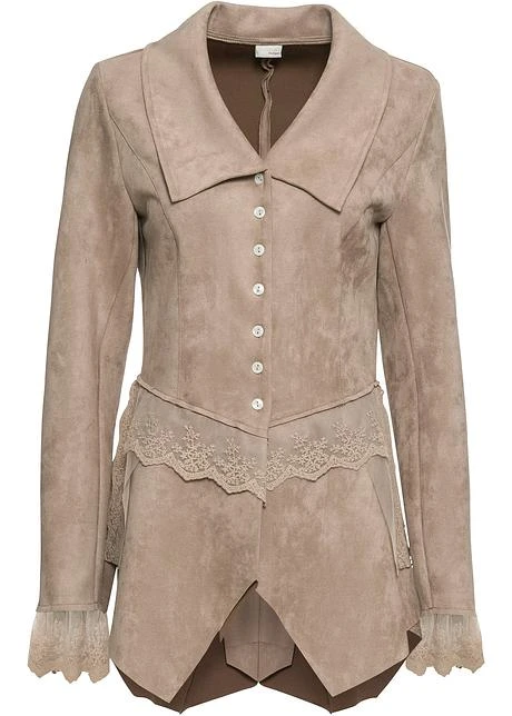 Cette veste est une pièce raffinée pour les occasions particulières. Les empiècements en dentelle au niveau des hanches et en bas de manches attirent particulièrement l’œil. Long. env. 76 cm.